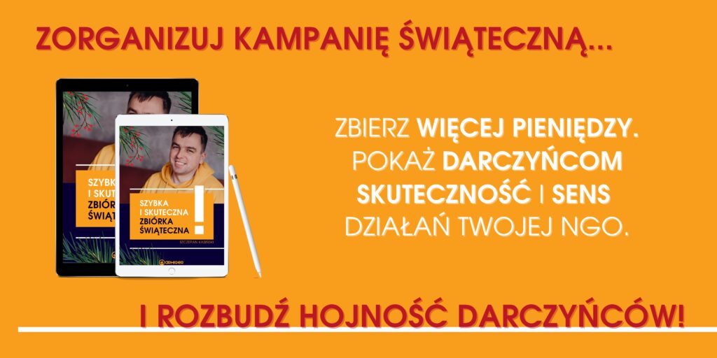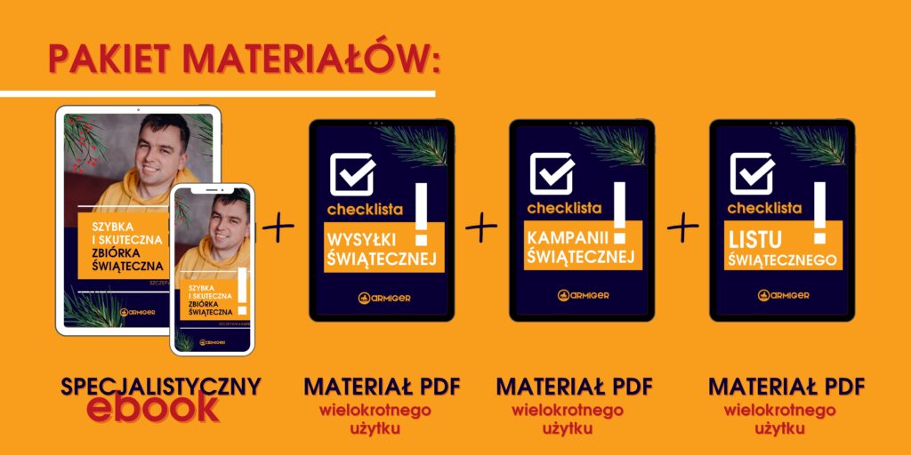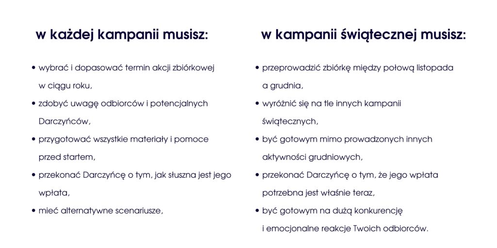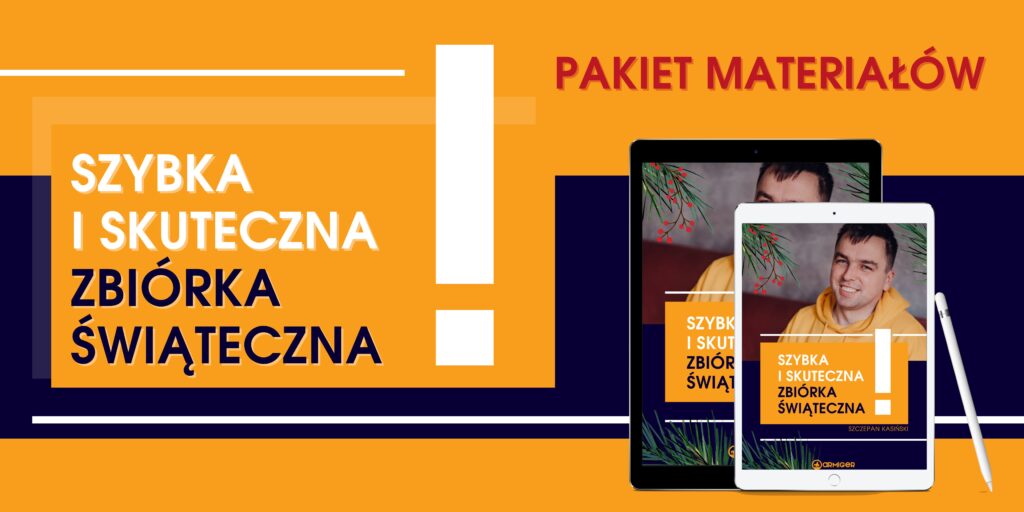 - checklista kampanii świątecznej, czyli co musisz przygotować, aby sprawnie przeprowadzić zbiórkę – od strony zbiórkowej, przez działania promocyjne, po obsługę Darczyńców,